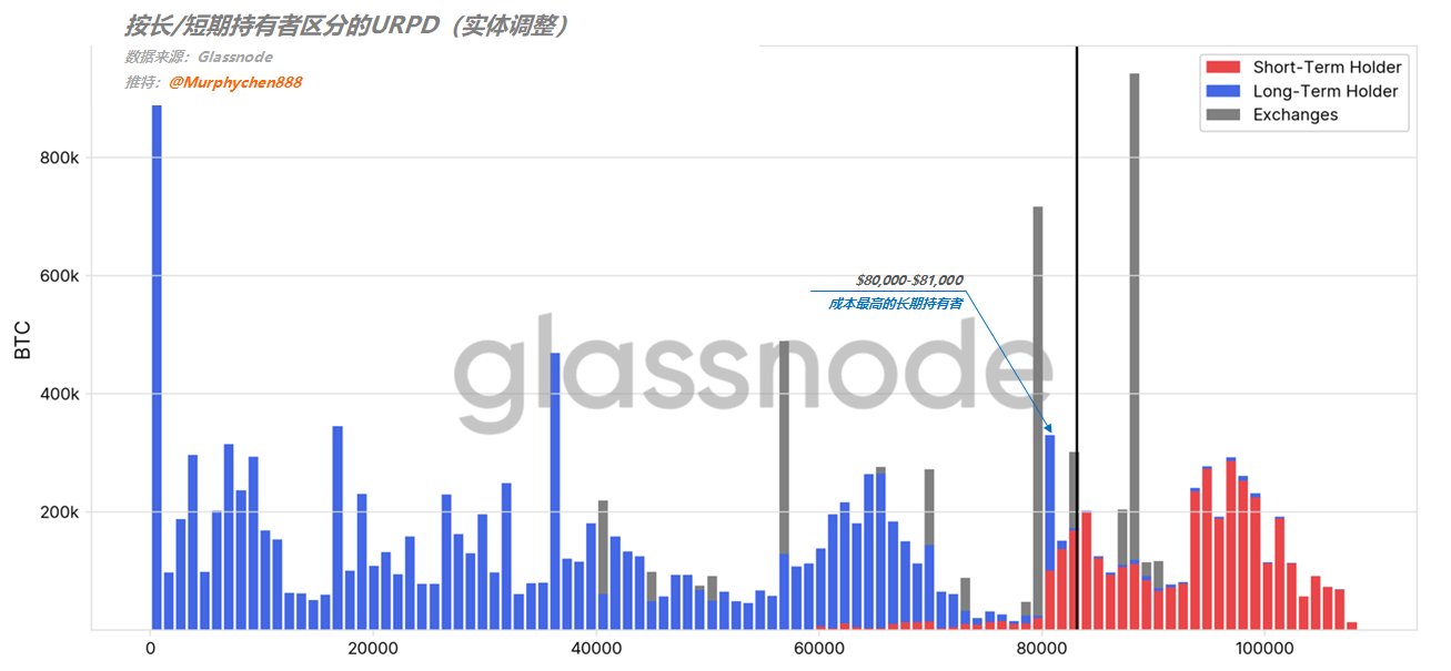 如图3所示,距离当前价格最近的长期持有者成本基础在$81,000左右,而且该群体拥有大致30w+枚BTC的规模。也就是说,当BTC价格低于8w美元时,这些由LTH所持有的BTC将进入亏损状态(所以$81,000也有很强的支持作用)。