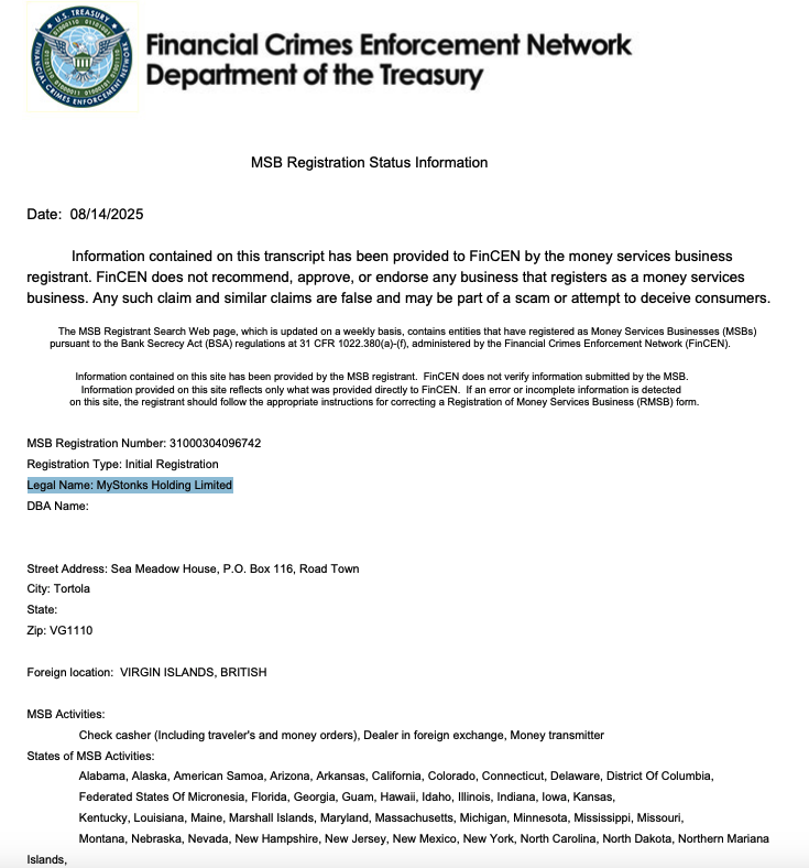 倪先生没找到的 我来帮他找到 因为注册MSB的不是 MyStonks Holding LLC 而是 MyStonks Holding Limited 可以自行去Fincen网站上下载 https://msb.fincen.gov/msb.registration.letter.php?ID=28211233