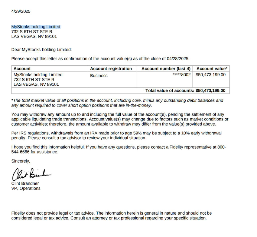 包括再加上以前的Fidelity的托管股票的证明也指向MyStonks Holding Limited