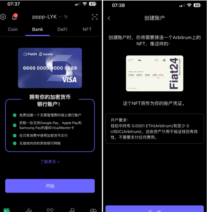 开始申请银行账户。打开App,找到”银行”选项。点击”开始”进入创建账户界面。继续点击“下一步”。
